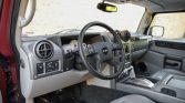The cabin features seats upholstered in Wheat leather, and the darker gray carpets are protected by Hummer-branded floor mats. Amenities include power-adjustable front seats, heated seats in the first two rows, and a single removable third-row seat, as well as four-zone automatic climate control, push-button 4WD controls, cruise control, and an optional CD stereo with navigation hooked to a Bose audio system.