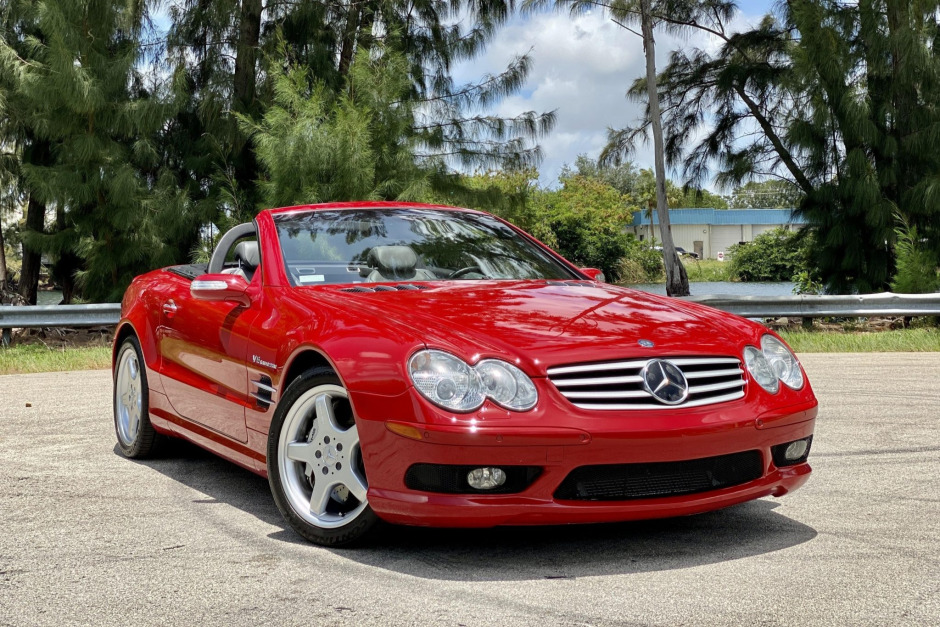 This 2004 Mercedes-Benz SL55 AMG is finished in Mars Red Metallic over charcoal leather and is powered by a supercharged 5.4-liter V8 paired with a five-speed automatic transmission. Equipment includes a retractable roof, Active Body Control (ABC) suspension, dual-zone automatic climate control, Distronic cruise control, Parktronic, Keyless-GO, COMAND with navigation and premium audio, AMG 18″ wheels and body styling, and heated and cooled multi-contour seats. The car was first delivered to Mercedes-Benz of Pompano Beach in Florida, and spent time in Ohio, Georgia, and Alabama before it was acquired by the selling seller.