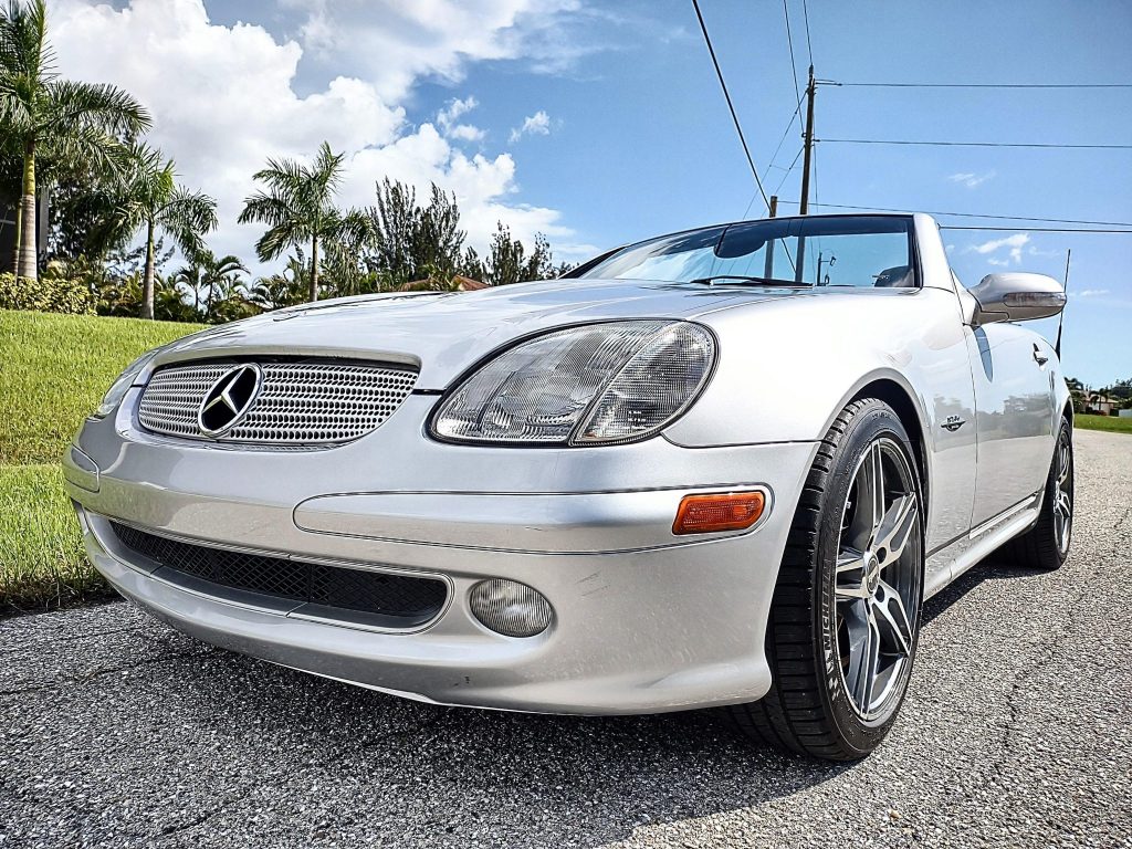 This 2004 Mercedes-Benz SLK230 Special Edition was sold new by Leikin Motors Co. in Willoughby, Ohio, and subsequently relocated to Florida where it was acquired by the seller in 2021. The car is finished in Brilliant Silver Metallic over Black Nappa leather, and power is from a supercharged 2.3-liter inline-four paired with a six-speed manual transmission. Equipment includes a power-retractable hard top, 17″ Moda wheels, air conditioning, heated seats, cruise control, and a factory sound system with CD changer.