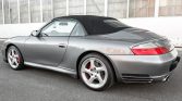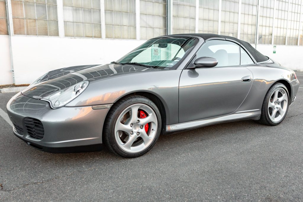 This 2004 Porsche 911 Carrera 4S cabriolet was originally built for use as a demonstration vehicle and is powered by a 3.6-liter flat-six paired with a six-speed manual transaxle and all-wheel drive. Finished in Seal Grey Metallic over Graphite Grey, the car is equipped with a black soft top, Porsche Stability Management, a wind deflector, carbon-fiber interior trim, a Bose sound system, a six-disc CD changer, automatic climate control, xenon headlamps, fog lights, cross-drilled brake rotors, and 18″ Turbo-look wheels. An LN Engineering IMS kit was installed in February 2021, and additional service performed this year included rebuilt front CV axles and a replacement coolant expansion tank.