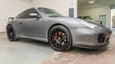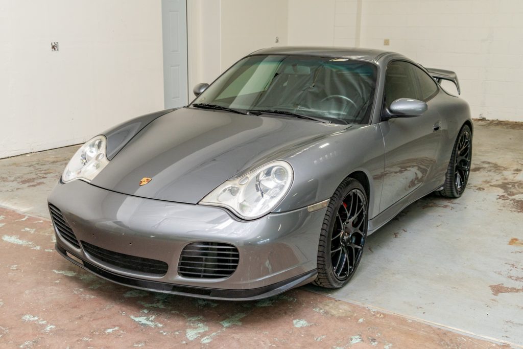 This 2004 Porsche 911 Carrera 4S coupe is finished in Seal Grey Metallic over black full leather upholstery and powered by a 3.6-liter flat-six mated to a six-speed manual transaxle and all-wheel drive. Equipment includes Porsche Stability Management, automatic climate control, a GT2-style rear spoiler, xenon headlights, aftermarket 19″ wheels, heated and power-adjustable front seats, and a Kenwood touchscreen stereo hooked to a Bose high-end sound system.