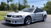 The exterior is finished in Silver Clearcoat Metallic (YN) with Saleen graphics and badging including a serialized production number affixed to the left side of the front bumper. The Saleen bodywork includes a louvered hood scoop, a rear wing, louvered side scoops, and urethane bumper covers and side skirts. The selling dealer notes a scuff on the edge of the front bumper.