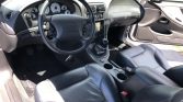 The seats are upholstered in Dark Charcoal leather with contrasting gray inserts. Body-colored switch bezels aLent the matching door panels and a serialized Saleen console plaque is mounted ahead of the shifter. Additional interior equipment includes air conditioning, cruise control, a Sony head unit, a Saleen close ratio shifter, and Saleen front sport seats.