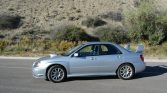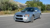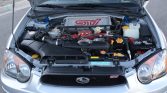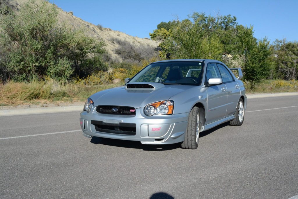 The car is finished in Platinum Silver Metallic and features an STi-specific front valance and fog light covers, an aluminum hood with a functional scoop, HID headlights, painted side skirts, and a rear wing.