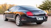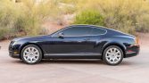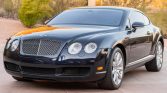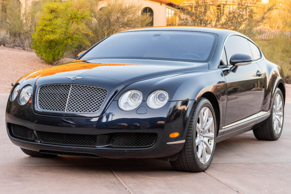 This 2005 Bentley Continental GT is finished in dark blue over cream leather and is powered by a twin-turbocharged 6.0-liter W12 paired with a six-speed automatic transmission and all-wheel drive. Equipment includes headlight washers, 19” wheels, heated and power-adjustable front seats, dual-zone automatic climate control, a navigation system, wood trim, and paddle shifters.