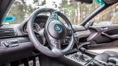 The cabin features seats upholstered in black Montana leather along with matching door panels and carpets, aluminum black cube trim, and an Alcantara shift boot. BMW-branded floor mats line the footwells, and amenities include power-adjustable and heated sport front seats, automatic climate control, a wind deflector, and a Harman Kardon sound system linked with a trunk-mounted Grom BT3 Bluetooth unit.