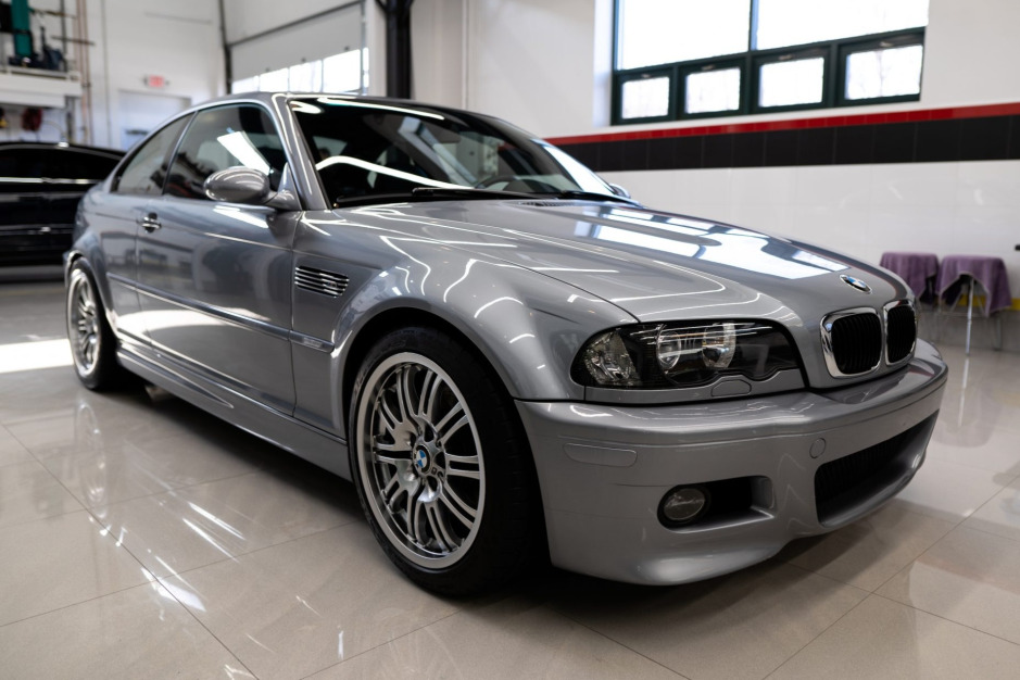 This 2005 BMW M3 coupe is finished in Silver Gray Metallic over black Nappa leather and is powered by a 3.2-liter inline-six paired with a six-speed manual transmission and a limited-slip differential. Factory equipment includes the Premium and Cold Weather packages, xenon headlights, a power sunroof, a rear spoiler, automatic climate control, a BMW Business CD stereo, and a Harman Kardon audio system. Services during current ownership has included the installation of replacement Style 67 wheels, suspension bushings…