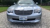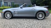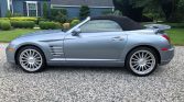 This 2005 Chrysler Crossfire SRT-6 convertible is powered by a supercharged 3.2-liter V6 paired with a five-speed automatic transmission and is finished in Sapphire Silver Blue Metallic over Dark Slate Gray. Equipment includes a power-operated soft top, a fixed rear spoiler, staggered-diameter wheels, heated power-adjustable seats, dual-zone climate control, and an Infinity CD stereo.
