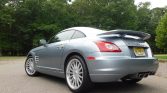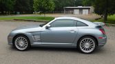 This 2005 Chrysler Crossfire coupe is one of approximately 2,500 SRT-6 examples produced, and it is finished in Sapphire Silver Blue Metallic over Dark Slate Grey upholstery. Power is supplied by a supercharged 3.2-liter V6 paired with a five-speed automatic transmission, and additional equipment includes staggered-diameter wheels, front and rear spoilers, power-adjustable and heated seats, air conditioning, and an Infinity CD stereo.