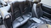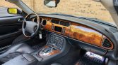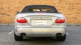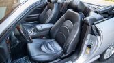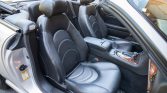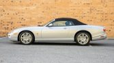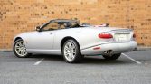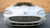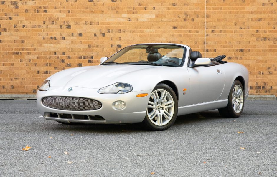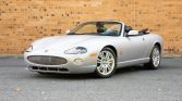 This 2005 Jaguar XKR convertible is finished in silver over charcoal leather, and power is provided by a supercharged 4.2-liter V8 paired with a six-speed automatic transmission. Equipment includes a black soft top, power-adjustable and heated front seats, an Alpine cassette stereo with a trunk-mounted CD changer, navigation, an active suspension, and Brembo disc brakes.