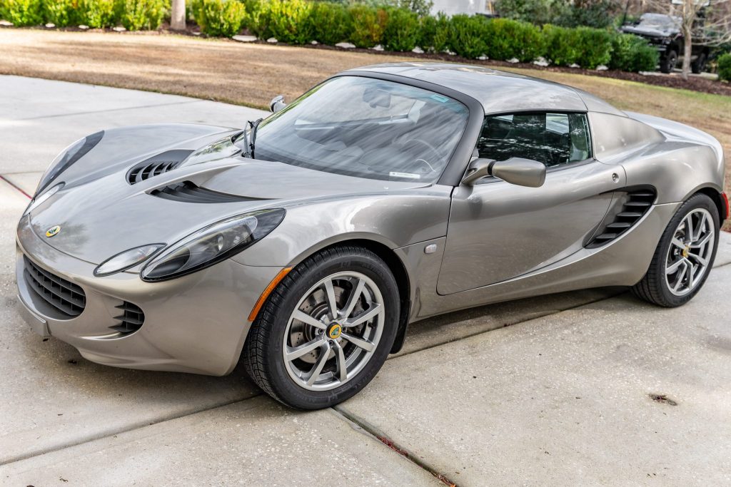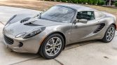 This 2005 Lotus Elise is powered by a mid-mounted 1.8-liter inline-four paired with a six-speed manual transaxle and is finished in silver over a black leather interior. Equipment includes a body-color removable roof panel, the Touring Pack, 16″ and 17″ alloy wheels, fixed-back bucket seats, air conditioning, and a Blaupunkt stereo.