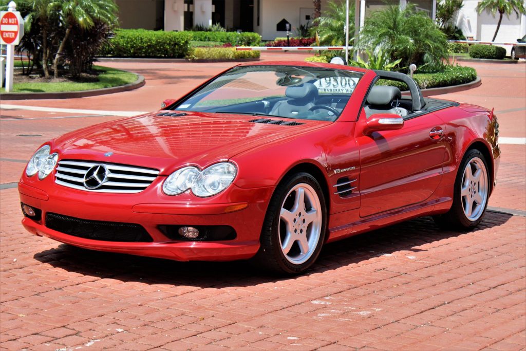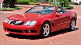 This 2005 Mercedes-Benz SL55 AMG is finished in red over black and charcoal leather, and it is powered by a supercharged 5.4-liter V8 paired with a five-speed automatic transmission. Equipment includes a power-retractable hardtop, bi-xenon headlights, 18″ AMG alloy wheels, Active Body Control suspension, dual-zone automatic climate control, Keyless Go, navigation, and a CD changer. The car was first registered in Florida and later spent time in California before being acquired by the seller in June 2021.