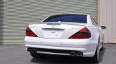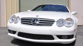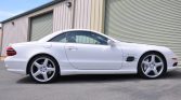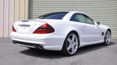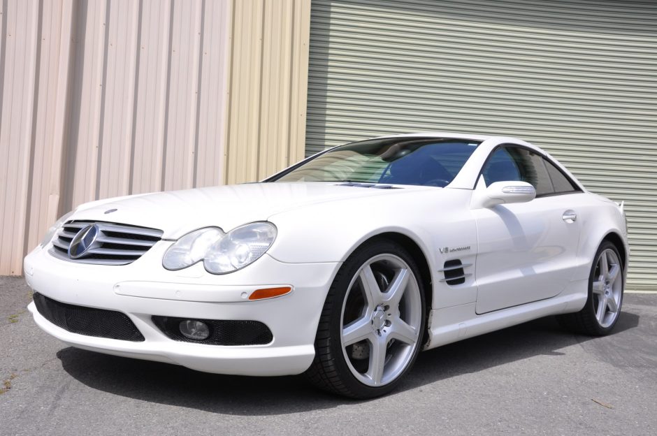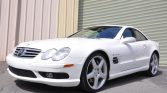 This 2005 Mercedes-Benz SL55 AMG is finished in white over black Exclusive leather, and its supercharged 5.4-liter V8 is paired with a five-speed automatic transmission. Features include a retractable hardtop, 20″ wheels, Active Body Control, heated and ventilated multi-contour seats, adaptive cruise control, Parktronic, and COMAND infotainment with navigation.