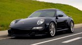 This 2005 Porsche 911 Carrera S coupe has 40k miles following registration history in California, and modifications include Fister Sports exhaust components, Bilstein coilovers, a Turbo-style rear wing, and an aerodynamic front bumper cover. The car is finished in black over matching leather, and it is powered by a 3.8-liter flat-six paired with a six-speed manual transaxle. Equipment includes the Sport Chrono Package Plus, 19″ Carrera Sport wheels, bi-xenon headlights, a sunroof, and Porsche Communication Management with navigation…