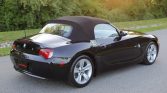 The car is finished in Black Sapphire Metallic (475) and is equipped with a black soft top, fog lights, and dual exhaust outlets exiting below the left side of…