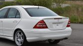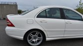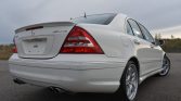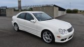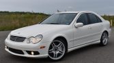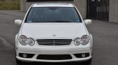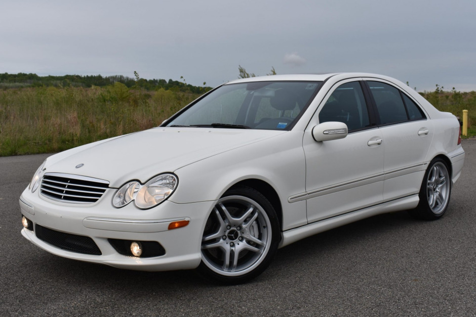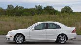 This 2006 Mercedes-Benz C55 AMG is finished in white over black leather and powered by a 5.4-liter V8 paired with a five-speed AMG Speedshift automatic transmission. Equipment includes 18″ AMG wheels, the AMG Styling Package, a glass sunroof, power-adjustable heated front seats, dual-zone automatic climate control, and Harman Kardon audio.