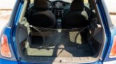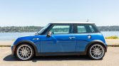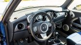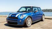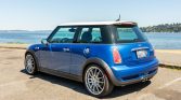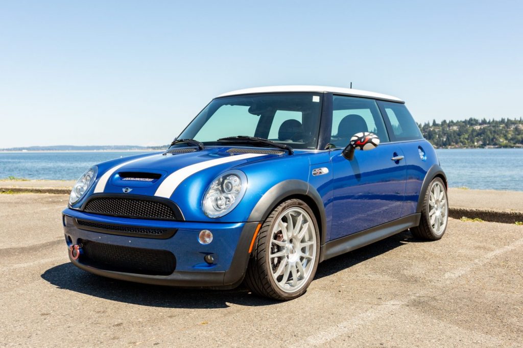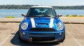 This 2006 Mini Cooper S is finished in Hyper Blue with a white top and hood stripes over two-tone black and gray leather. Power is delivered by a supercharged 1.6-liter inline-four with a Madness Motorworks Stage 2 tune paired with a six-speed manual transaxle. Factory equipment consists of the Mini Sports and Entertainment packages, xenon headlights, air conditioning, cruise control, and a panoramic sunroof, while performance modifications include an ECU tune, an uprated supercharger pulley, a sports cat-back stainless-steel exhaust, H&R sport springs, OZ Racing 18″ wheels, Wilwood front brake calipers, and a cold-air intake.