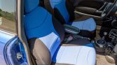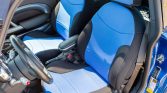 The car is finished in Hyper Blue (A53) with a white top and hood stripes in addition to black fender flares and side sills. Exterior equipment includes xenon headlights with washers, speed-sensitive windshield wipers, a hood scoop, a dual-pane panoramic sunroof, a hatch spoiler, driving lights, black upper and lower front grilles, and center-exit dual exhaust outlets. Additional exterior modifications include RaceFace ‘eyeballs’ body wraps on the mirror caps, a rear wiper delete kit, and an Alta Mini billet radio antenna.