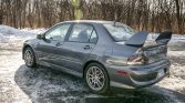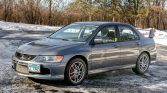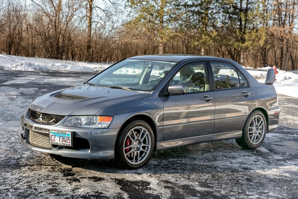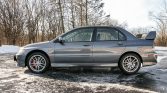 This 2006 Mitsubishi Lancer Evolution IX is finished in gray over a black leather and Alcantara interior and is powered by a turbocharged 2.0-liter inline-four. Equipment includes a five-speed manual transaxle, limited-slip front and rear differentials, projector headlamps, fog lamps, a vented hood, a rear wing, a rear wiper, 17″ wheels, Brembo brake calipers, Recaro bucket seats, air conditioning, and a JVC CD stereo system.