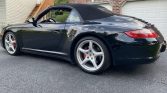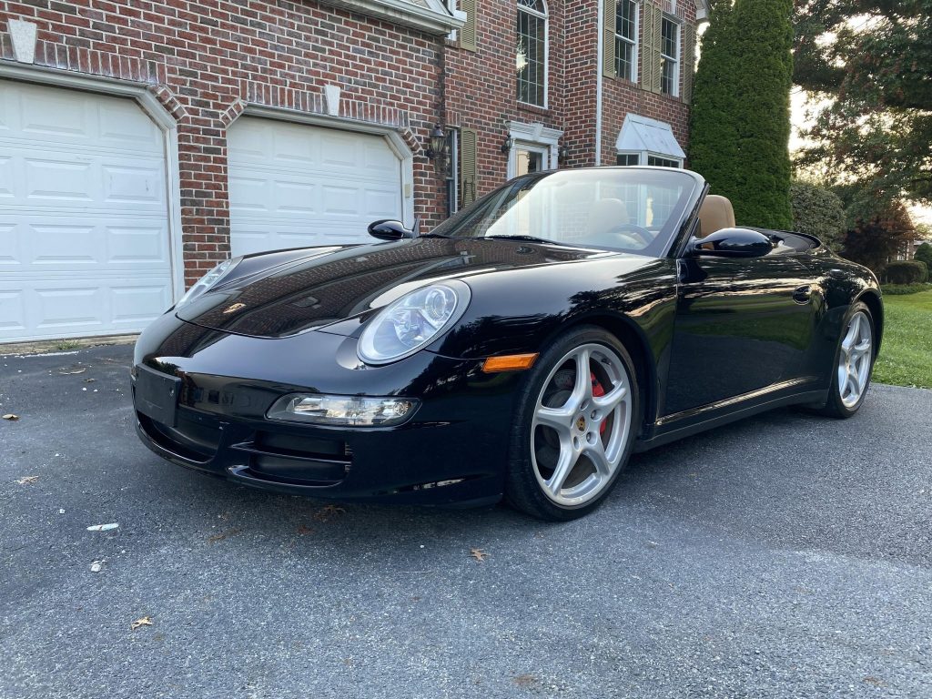 This 2006 Porsche 911 Carrera 4S cabriolet is finished in black over tan leather and is powered by a 3.8-liter flat-six mated to a six-speed manual transaxle and all-wheel drive. Equipment includes a black convertible soft top, 19″ Carrera Classic wheels, the Sport Chrono Package, bi-xenon headlights, heated and power-adjustable seats, navigation, automatic climate control, and a Bose audio system. The car was first registered in Arizona and spent time in California and Maryland prior to the…