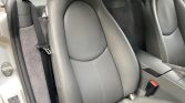 The cabin features heated seats upholstered in Stone Grey leather with matching plastics and carpets, the latter of which are protected by black Porsche-branded floor mats. Additional amenities include cruise control, air conditioning, heated seats, and a factory CD stereo.