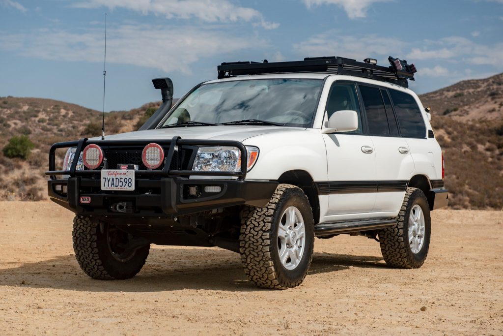 This 2006 Toyota Land Cruiser is finished in white over beige and is powered by a 4.7-liter V8 paired with a five-speed automatic transmission, a dual-range transfer case, and a locking center differential. Equipment includes a sunroof, an aftermarket roof rack, an ARB front bumper with a Warn winch, a Slee rear bumper and tire carrier, Slee rock sliders, a dual battery system, aftermarket LED fog and roof lights, ARB front and rear air lockers, heated front…