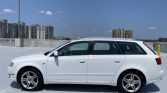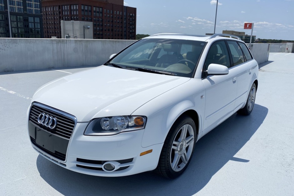 This 2007 Audi A4 Avant 2.0T was first registered in Maryland and remained with its original owner until July 2021, when it was acquired by the seller. The car is finished in Ibis White over beige leather and is powered by a turbocharged 2.0-liter inline-four mated to a six-speed manual transmission and a Quattro all-wheel-drive system. Equipment includes 17″ wheels, a glass sunroof, dual-zone automatic climate control, a power-adjustable driver seat, a cargo cover with rear sunshade, and an Audi Symphony CD stereo. A July 2021 service included replacements of the timing belt, spark plugs, front brake rotors and pads, and tires as well as an oil change, a coolant flush, and a differential fluid change.