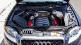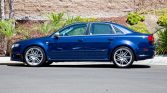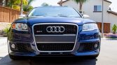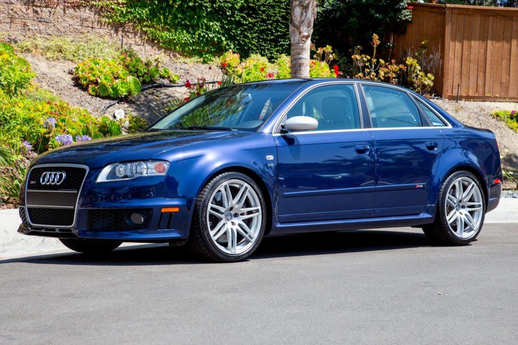 This 2007 Audi RS4 is finished in Mugello Blue Pearl Effect over Silver Nappa leather and powered by a 4.2-liter V8 paired with a six-speed manual transaxle and all-wheel drive. Equipment includes a sunroof, heated front and rear seats, automatic climate control, carbon-fiber trim, 19″ wheels, integrated fog lights, navigation, rear sun shades, and a Bose premium sound system. The car was first registered in Michigan, and it was acquired by the current owner in 2018 and relocated to California. Replacement tires were mounted in 2018, and an oil change was performed in preparation for the sale.