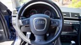 The exterior is finished in Mugello Blue Pearl Effect and features a sunroof, a rear lip spoiler, contrasting mirror caps, integrated fog lights, RS4 badging, rear parking sensors, and concealed headlight washers.
