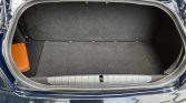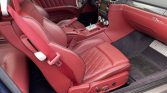 The cabin features seats upholstered in Bordeaux leather with quilted inserts and blue piping as well as matching door panels, a Blu Scuro upper dashboard, and blue carpets and floor mats. Carbon fiber aLents the dashboard, and equipment includes dual-zone automatic climate control, a navigation system, and a Bose Hi-Fi audio system with a CD player. Wrinkles are visible on the rear parcel shelf.