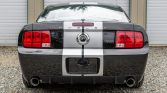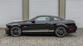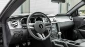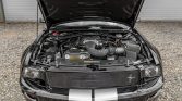 The body is finished in black (UA) with silver racing stripes and features a hood scoop, a billet grille insert, revised fascias and side scoops, “Powered by Ford” fender badges, “Shelby” trunk lid lettering, and hood hold-down pins. The rear spoiler was deleted as part of the ‘GT Upfitters’ package.