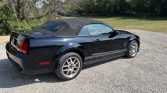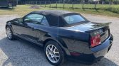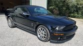 The car is finished in black and features a power-retractable black soft top, fog lights, hood vents, a rear spoiler, Shelby badging, GT500 rocker panel graphics, and polished exhaust outlets.