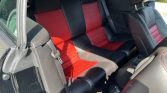 The cabin features sport bucket seats upholstered in Charcoal Black and Crimson Red leather with embossed Shelby Cobra logos on the backrests. Equipment includes a Shaker 1000 sound system, a CD stereo, cruise control, and air conditioning.