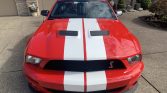 The car is finished in Torch Red with Shelby white-tape stripes. Features include an aluminum hood with functional vents, fog lights, a front lip spoiler, a decklid spoiler, sequential taillamps, and Shelby GT500 badging and graphics on the fenders, grille, and trunk.