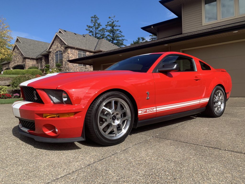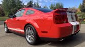 This 2007 Ford Shelby GT500 coupe is finished in Torch Red with white stripes over red and black leather and is powered by a supercharged 5.4-liter V8 paired with a six-speed manual transmission. Features include 18″ machined aluminum wheels, Brembo front brakes, an SVT-tuned suspension, a rear spoiler, sequential taillamps a power-adjustable driver’s seat, and a Shaker 1000 audio system with a six-disc in-dash CD player. The battery was replaced in 2019.