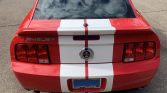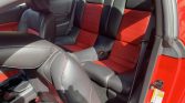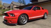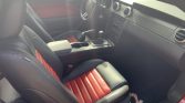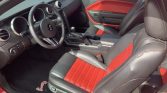 The seats have black leather bolsters, red perforated inserts, and embossed Cobra logos. Equipment includes air conditioning, Cobra-branded floor mats, power windows, SVT door sill plates, a six-disc in-dash CD stereo, a power-adjustable driver’s seat, and a Shaker 1000-watt audio system with satellite radio.