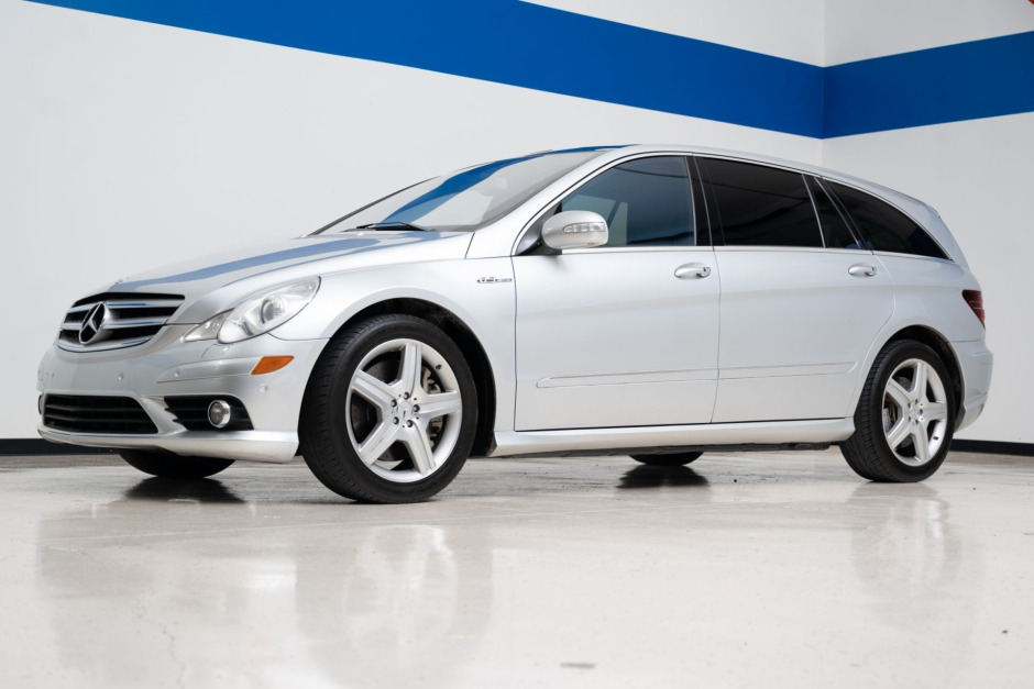 This 2007 Mercedes-Benz R63 AMG is one of approximately 200 examples sold worldwide during the single year of production. The car is finished in silver over black leather, and power is from a 6.2-liter V8 paired with a seven-speed automatic transmission and a 4MATIC all-wheel-drive system. Additional equipment includes 20″ AMG wheels, bi-xenon headlights, heated and multi-contour front seats, COMAND infotainment with navigation, a panoramic sunroof, a rear-view camera, Parktronic, and Keyless Go.
