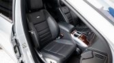 The body is finished in Iridium Silver (775) and is equipped with AMG-specific bodywork, quad exhaust outlets, bi-xenon headlights with dynamic cornering, fog lights, and AMG badging. Tint film has been applied to the windows. The Carfax report notes “very minor damage” to the front-right of the vehicle caused by a sideswipe collision in October 2014. Rock chips are visible on the front end and around the body.