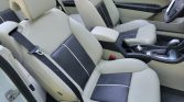 The heated and power-adjustable front bucket seats are upholstered in Parchment leather with black inserts, which extends to the rear bench seat. Amenities include driver’s seat position memory, dual-zone automatic climate control, cruise control, a CD stereo, and an auto-dimming rearview mirror with an integrated compass and a garage door transmitter. The car is equipped with Night Panel, which reduces cabin and instrument-panel lighting for nighttime driving.