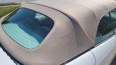 The car features Aero bodywork including a decklid spoiler and is finished in Polar White with a power-operated Sand soft top. Additional details include xenon headlights with washers as well as fog lights, rain-sensing windshield wipers, power-adjustable mirrors, rear parking sensors, and dual polished exhaust outlets. Scuffs are noted on the front spoiler.