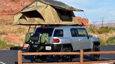 The roof-top Smittybilt Overlander tent features aluminum frame poles, LED strip interior lights, a foam mattress, a telescoping aluminum ladder, and stainless steel hinges.