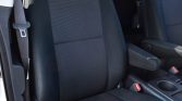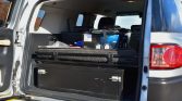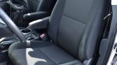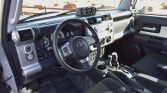 The cabin features front bucket seats and a 60/40 rear bench seat upholstered in gray water-repellent fabric. Features include cruise control, rubber floors, power locks and windows, and an AM/FM/CD stereo. The rear cargo area is equipped with a storage drawer and off-road recovery tools.