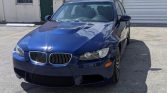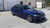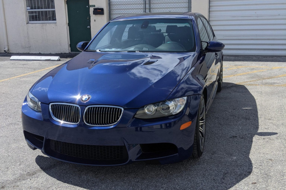 This 2008 BMW M3 sedan is finished in Interlagos Blue Metallic over black leather and powered by a 4.0-liter V8 paired with a six-speed manual transmission and a limited-slip differential. Equipment includes a sunroof, power-adjustable front seats, carbon-look leather trim, automatic climate control, forged 19″ alloy wheels, Comfort ALess, Dynamic Stability Control, Electronic Damper Control, and a factory CD stereo with navigation.
