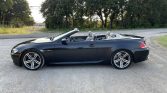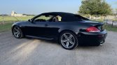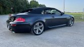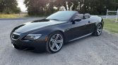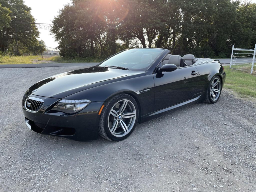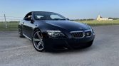 This 2008 BMW M6 convertible is finished in Black Sapphire Metallic over Light Sepang Bronze Merino leather, and it is powered by a 5.0-liter V10 paired with a six-speed manual transmission. Equipment includes a power-operated black soft top, adaptive xenon headlights with washers, iDrive infotainment with navigation, heated and power-adjustable front sport seats, and Park Distance Control, and the car is fitted with BC Racing coilover suspension and a modified exhaust system. The car was first registered…