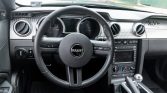 The leather-wrapped steering wheels features a Bullitt horn button and frames a 145-mph speedometer, a tachometer, and auxiliary gauges. The digital odometer indicates 13k miles.