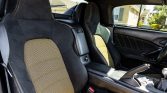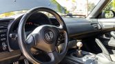 The cockpit features seats upholstered in black Alcantara with yellow patterned inserts and matching yellow stitching that extends to the steering wheel, shift boot, and door panels. This example is equipped with air conditioning and a factory CD stereo in addition to cruise control, an aluminum shift knob and pedals, and S2000-branded floor mats.