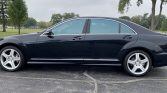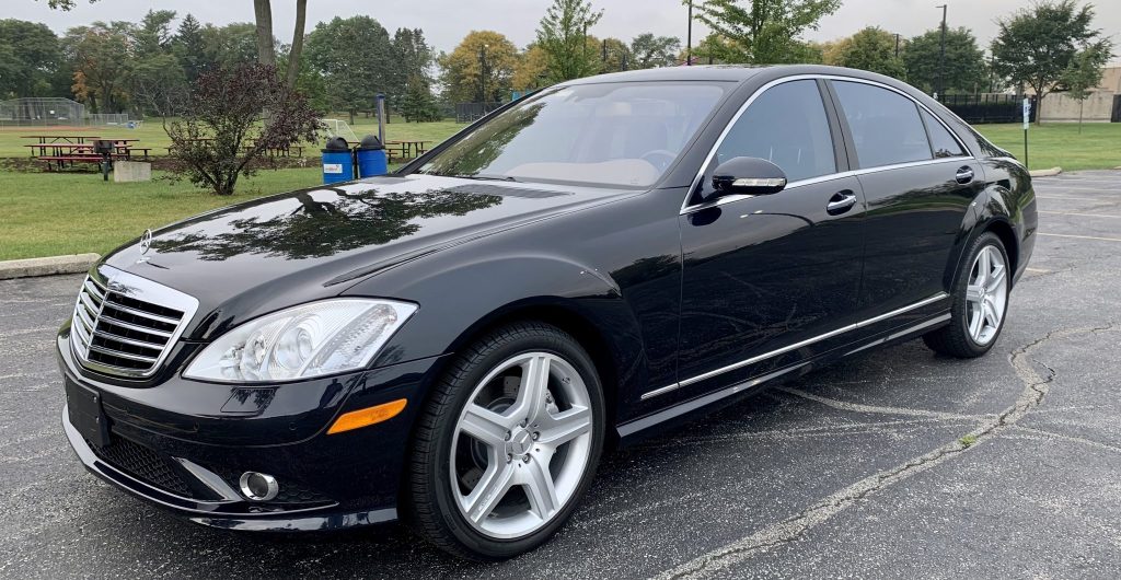 This 2008 Mercedes-Benz S550 4MATIC is finished in Chromite Metallic Black over brown leather and powered by a 5.5-liter V8 driving all four wheels through a seven-speed automatic transmission. Equipment includes the AMG styling package, 19″ AMG wheels, adaptive xenon headlamps, a power sunroof, Parktronic, Night View Assist, Keyless-GO, heated and ventilated dynamic front seats, dual-zone automatic climate control, navigation, an electric rear sunshade, and a Harman Kardon audio system.