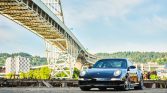 Polished 19″ Turbo wheels wear Porsche-crest center caps and are mounted with 235/35 front and 305/30 rear Michelin Pilot Super Sport tires. Braking is from red-finished multi-piston calipers over cross-drilled rotors at each corner. Wheel spacers and Eibach sport springs are said to have been installed under current ownership.