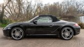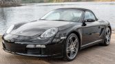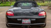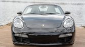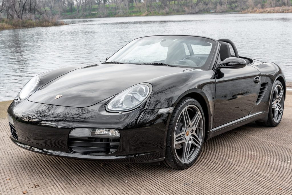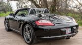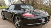 This 2008 Porsche Boxster is powered by a 2.7-liter flat-six paired with a five-speed manual transaxle and is finished in black over matching leather upholstery. Equipment includes a black soft top, 19″ Turbo wheels, a deployable rear spoiler, bi-xenon headlights, heated seats, a Bose sound system, and automatic climate control.