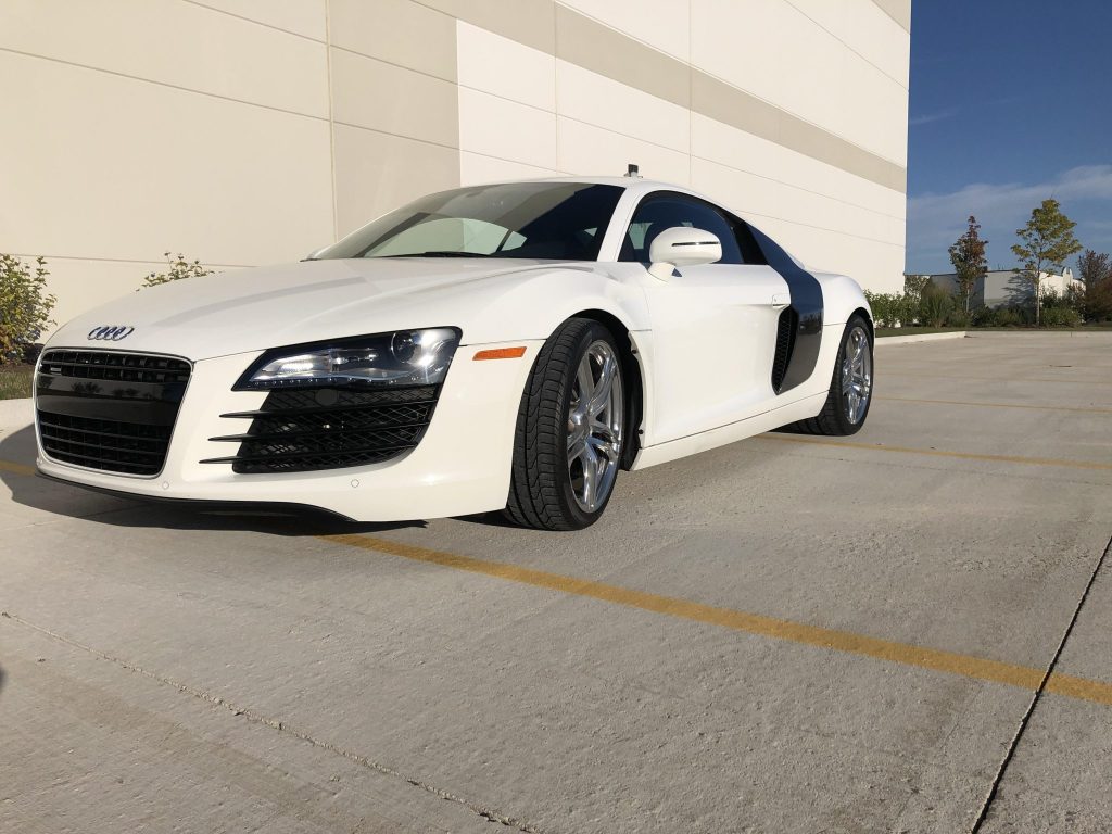 This 2009 Audi R8 coupe is finished in Ibis White over Black Nappa leather and powered by a 4.2-liter V8 paired with a six-speed manual transaxle and a Quattro all-wheel drive system. Equipment includes 19″ wheels, black side blades, the Premium package, heated and power-adjustable seats, a Bang & Olufsen sound system, Navigation Plus, and parking sensors. The car was delivered new to Suncoast Motorsports Audi of Sarasota, Florida and later relocated to Illinois where it was acquired by the seller in 2017. Service in September 2021 included replacement of the transmission, air conditioning compressor, water pump, clutch, flywheel, timing cover gasket, and front struts.